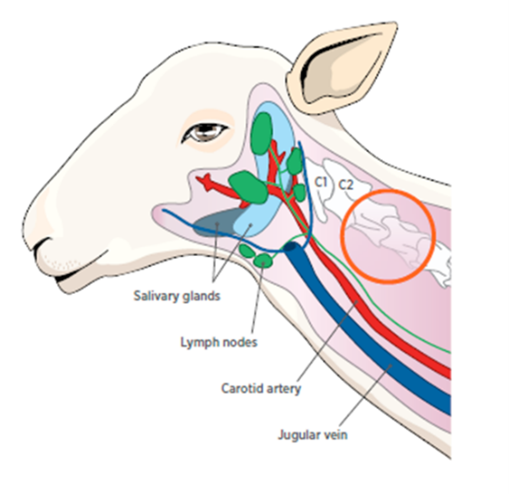 Before commencing   lamb marking vaccination ensure you have the correct equipment. For sheep vaccines use a clean, accurate vaccinator of an appropriate size, generally this is a 1ml quickshot. You can check the accuracy of your vaccinator  by running water through the applicator and counting the number of doses into a measuring flask.  Always use 6mm (1/4”) 18G needle. Subcutaneous vaccines are best given under the skin on the side of the neck, approximately 50mm down from the ear, on the side of the neck. See Figure 1. Diagram highlighting correct vaccination site. Studies have shown 12mm (½”) needles will likely puncture the muscle and increase the risk of damage to the carcase.