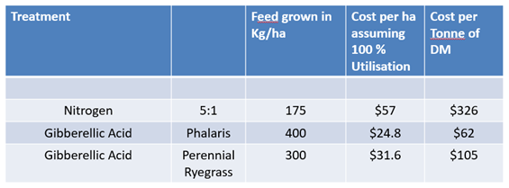 We recently conducted a cost comparison taking into account product applied and application costs, see Table 1, we found not only that the cost per tonne of dry matter produced varied significantly, but that also when the response time to grazing was 21 days for GA versus between 36 and 90 days for the Urea, the use of Gibberellic Acid was the least expensive per tonne of dry matter produced.